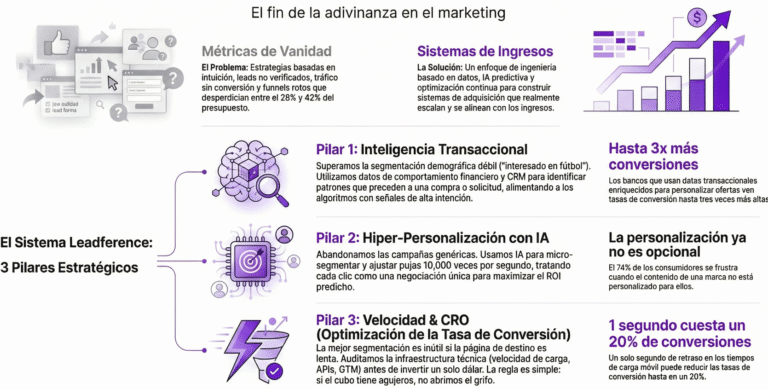 Puede tener la mejor segmentación, pero si su landing page carga en 4 segundos, ha perdido el 30% del tráfico antes de empezar. En Leadference, auditamos la infraestructura técnica antes de gastar un centavo en ads.